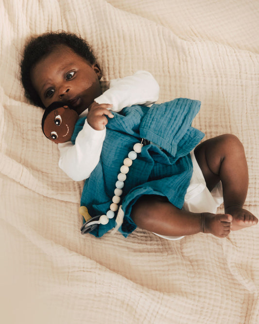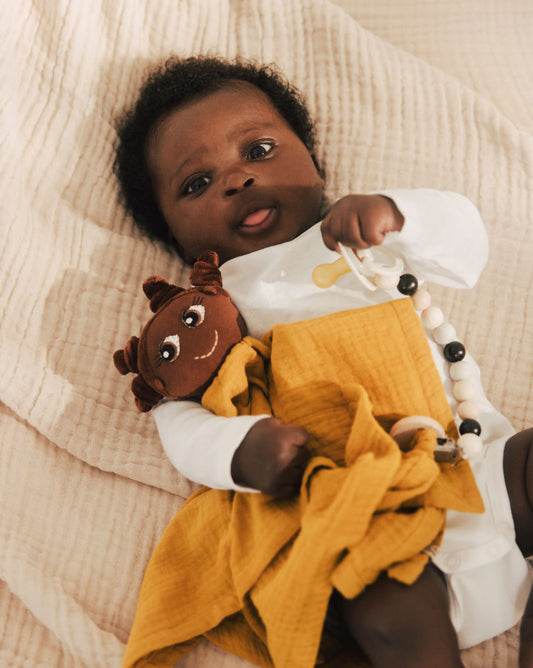 Tauche ein in die Welt unserer Kuscheltücher aus Bio-Baumwolle, die mit einem einzigartigen Schnullerband-Detail erfreuen! Hergestellt aus sorgfältig ausgewählten Materialien bieten sie ein sanftes und kuscheliges Gefühl auf der Haut der Babys. Mit ihrem süßen Design und der nachhaltigen Herstellung sind sie eine umweltfreundliche Wahl. Verwöhne dein Baby mit diesem saugfähigen und gleichzeitig praktischen Kuscheltuch, das sicherstellt, dass der Schnuller immer griffbereit ist!